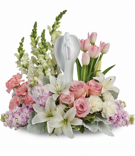 Show them you care with this gorgeous display of roses, lilies and tulips, gracefully surrounding a timeless angel sculpture keepsake. Beautifully fragrant, it's a hopeful tribute that will warm their hearts forever. Approx. 18 W x 16 1/2 H